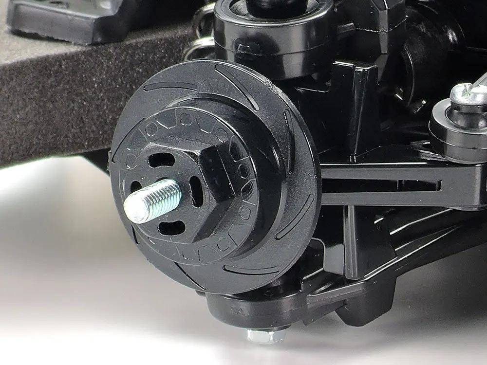 The shaft-driven 4WD TT-02 chassis employs a longitudinal layout with the battery on the left and the motor on the right, to give excellent stability. In addition, it features identical left and right suspension arms and uprights for ease of assembly, plus easy-to-maintain gearboxes. It is a highly adaptable chassis, as it offers 2 different wheelbases, 2 ground clearance settings and 2 tread set-ups in addition to a range of 10 possible gear ratios. It is not short on looks either, with brake disc-shaped wheel hubs and stylish front bumper supports. White dish wheels use racing radial tires.