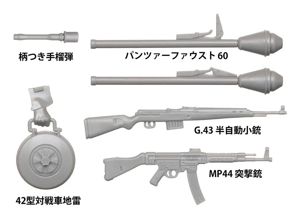 In the second half of WWII, German troops' M43 uniforms were rather simplified and in a different material to early war designs (largely as a cost-saving measure), although some soldiers still used their older gear, or even wore their Zeltbahn shelters as a makeshift poncho. Meanwhile weaponry had advanced since the start of the conflict, and German troops often toted the G.43 semi-automatic rifle, the MP44 sub-machine gun, and the Panzerfaust anti-tank weapon.
